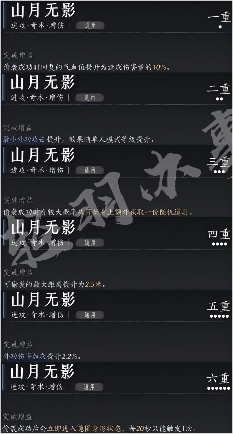 山月无影(通) | | 清河·齐声处五音启太平玩法点天赋获得,累计需要9个蹊跷可拿到——象工之乐一 | |