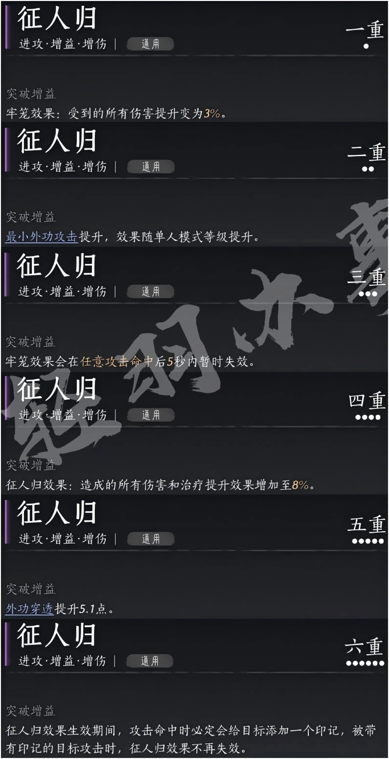 征人归(通) | | 首通清河·镇守·弱水岸奖励,需击败首领寻心。(在清河主章任务中) | |