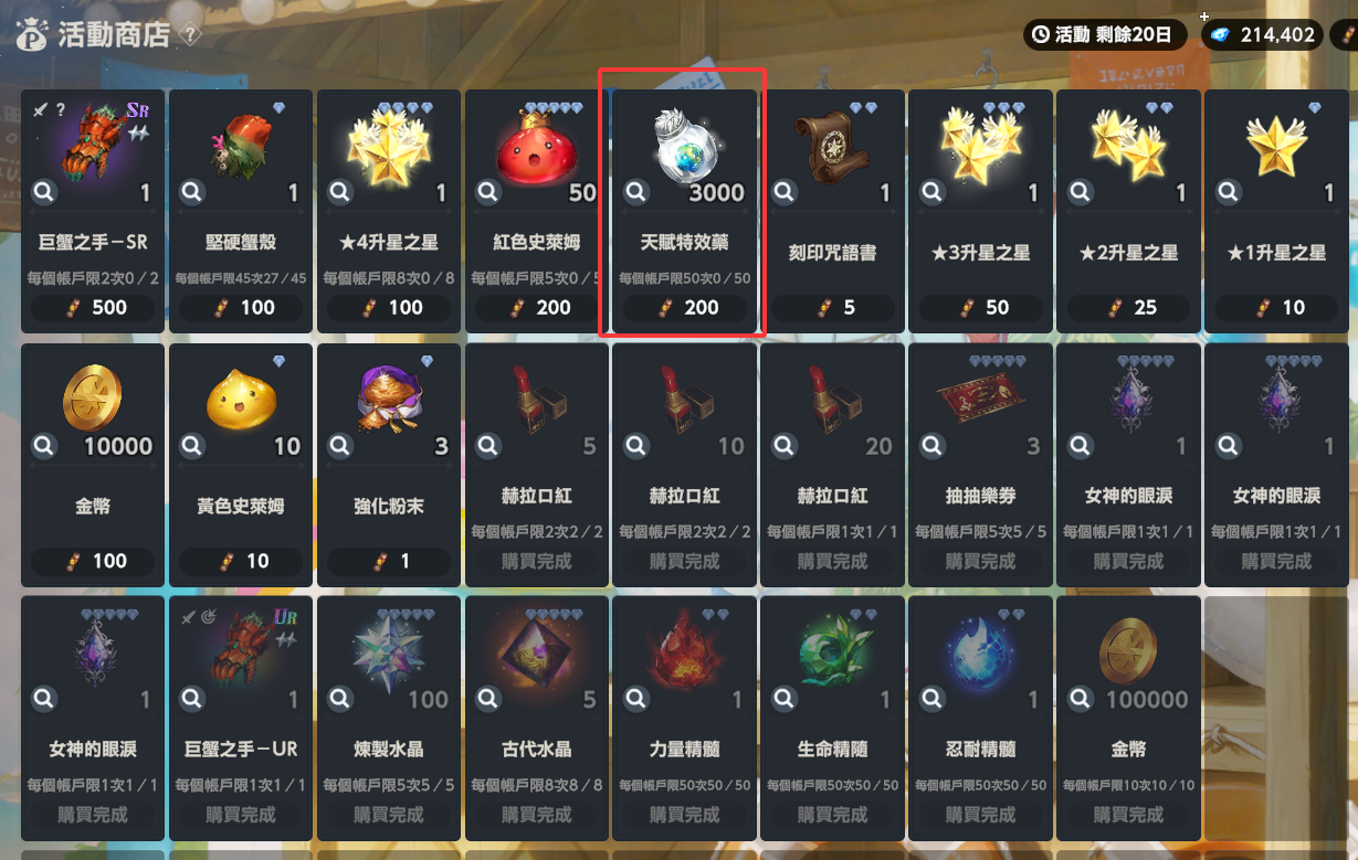 如果天赋药用完了有两种办法获得,第一种是每期活动的商店可以消耗活动货币兑换,第二种是可以在每个章节的商店购买!