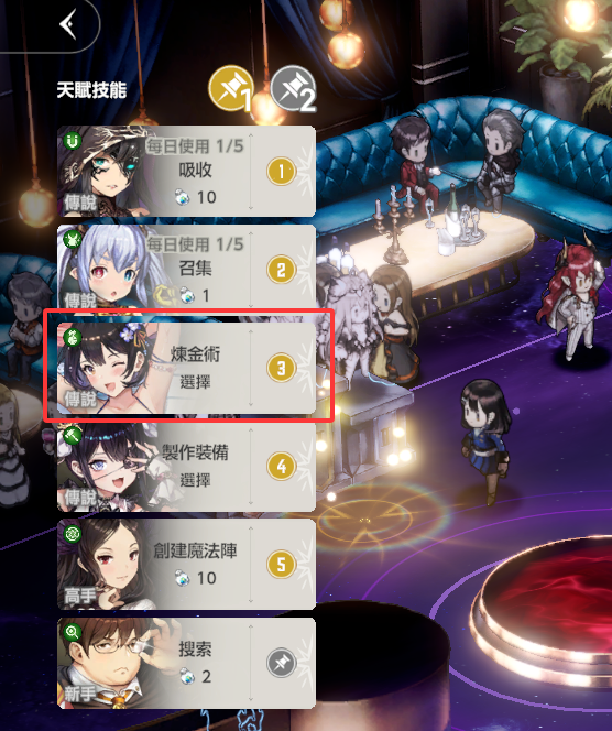 这里可以使用初级材料合成高级材料,跟锻造同理,只要合成材料就可以获得天赋经验,满了之后就可以升星了!我们缺材料就用炼金术合成就行。