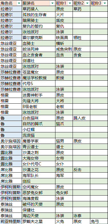 角色服装 昵称/别称/称呼/黑话 【腾讯文档】棕色尘埃2角色昵称 https://docs.qq.com/sheet/DWnd0WERia2FIckZS?tab=000002