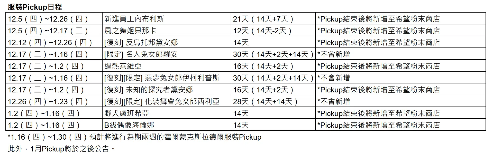 总共有12种★5服装将进行上调,以便能够执行其原本预期的作用。