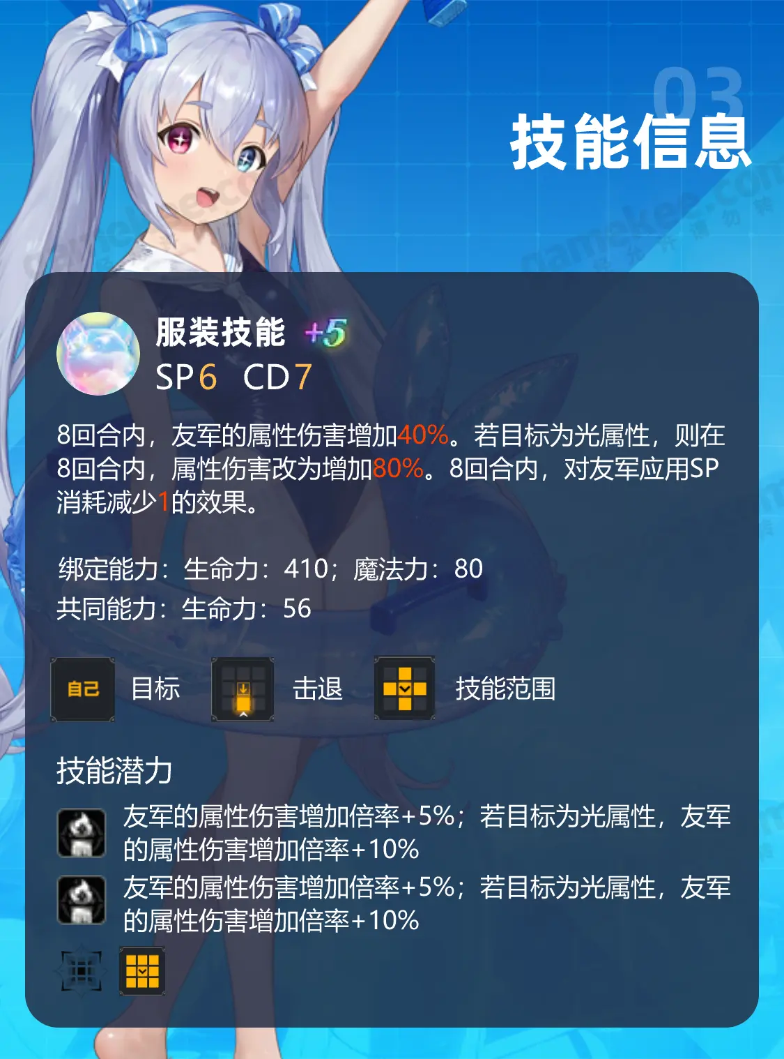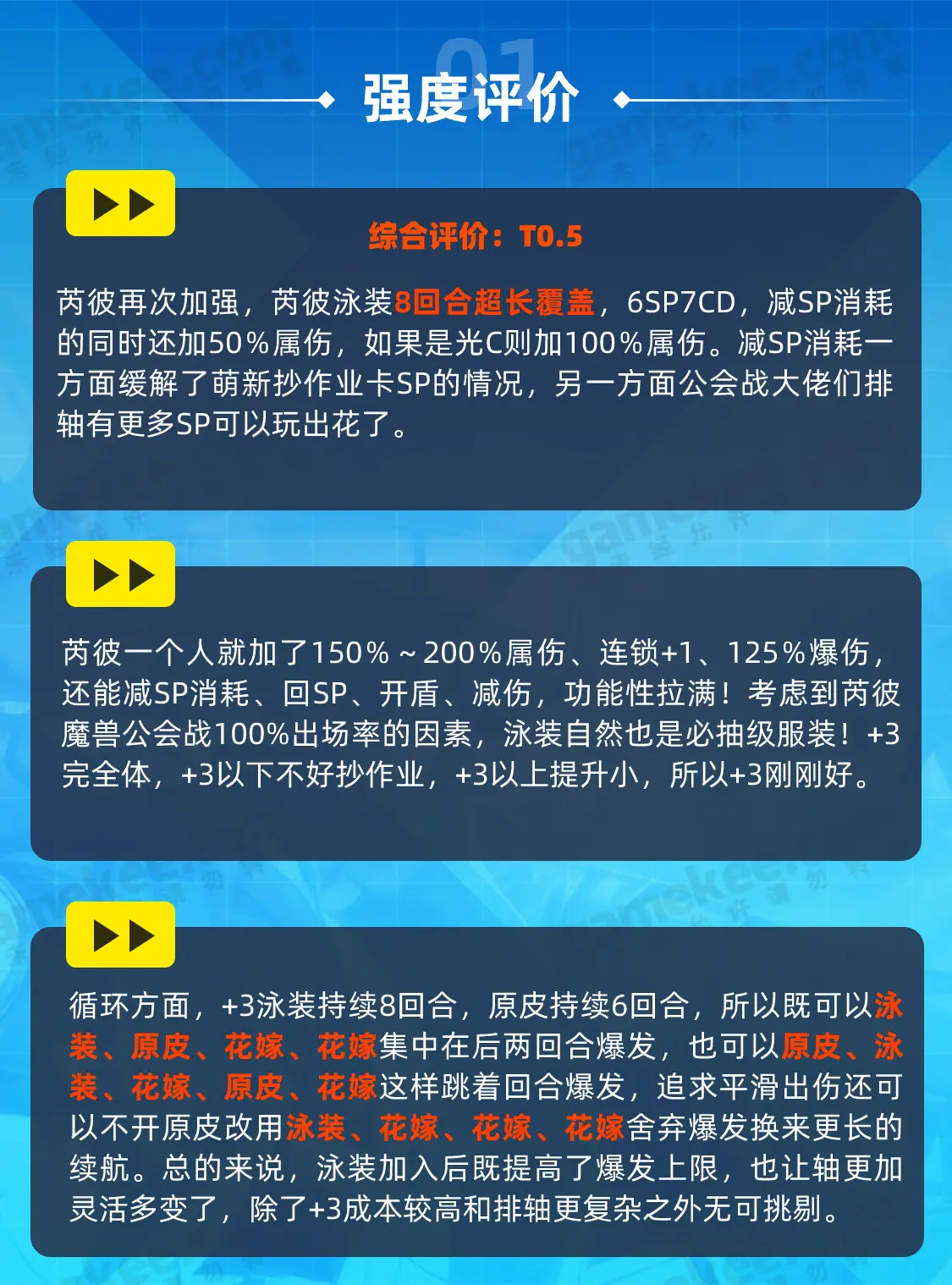 美中不足的是,泳装单皮加的数值不算很高,和原皮的提升半斤八两,但整体来看芮彼一个人就加了150%~200%属伤、连锁+1、125%爆伤,还能减SP消耗、回SP、开盾、减伤,功能性拉满!考虑到芮彼魔兽公会战100%出场率的因素,泳装自然也是必抽级服装!+3完全体,+3以下不好抄作业,+3以上提升小,所以+3刚刚好。