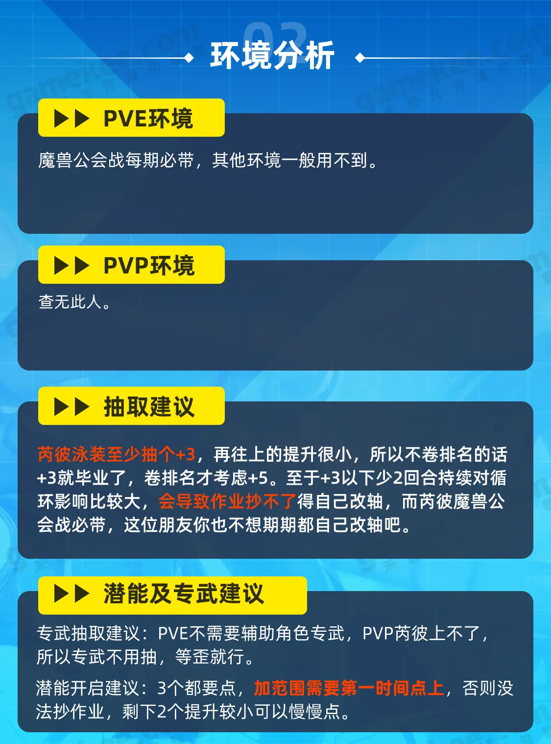 芮彼泳装至少抽个+3,再往上的提升很小,所以不卷排名的话+3就毕业了,卷排名才考虑+5。至于+3以下少2回合持续对循环影响比较大,会导致作业抄不了得自己改轴,而芮彼魔兽公会战必带,这位朋友你也不想期期都自己改轴吧。