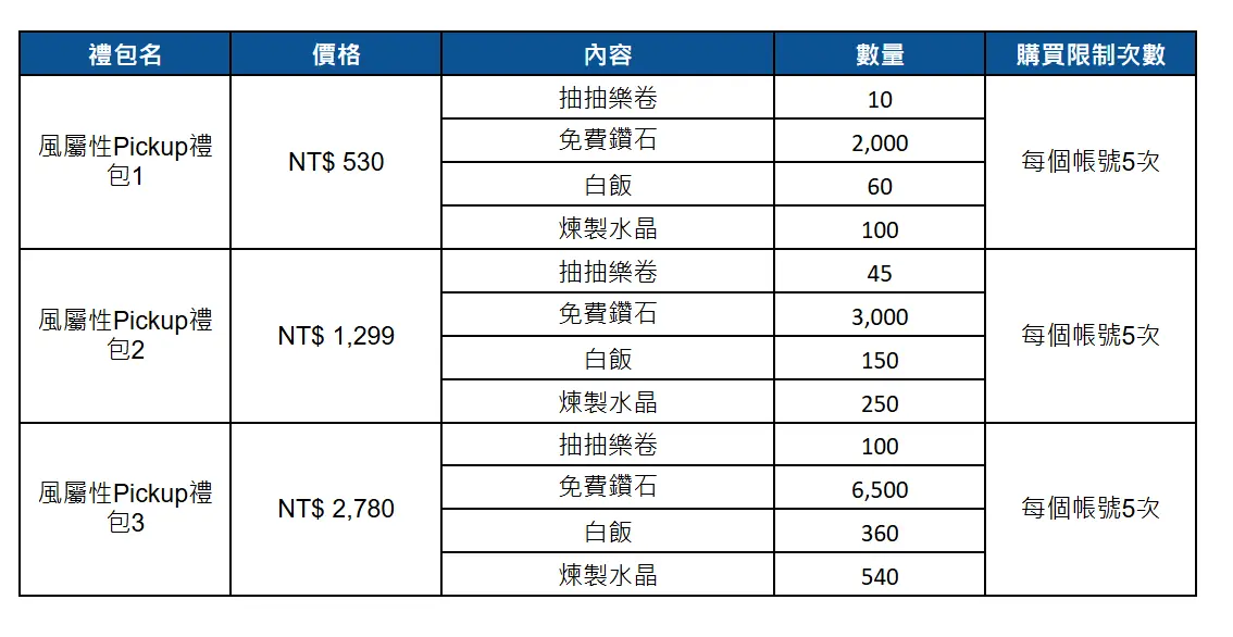 - 每日签到奖励将于每日上午9点开始依序发放,礼包内容与价格如下: