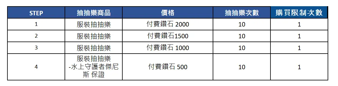 ※ STEP 1 ~ 4 的抽抽乐中不包含限定服装及正在进行Pickup的服装。然而,会包含水上守护者杰尼斯。