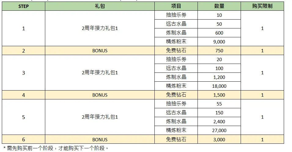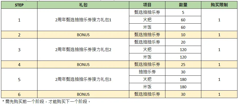 - step-up抽抽乐每个阶段都有不同的抽抽乐商品,完成购买前一阶段后,将会解锁下一阶段。