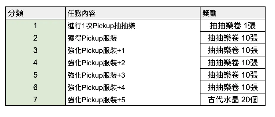 -复刻Pickup活动时,会以之前强化过的任务等级为准进行Pickup活动。已经获得的奖励无法再次获得。