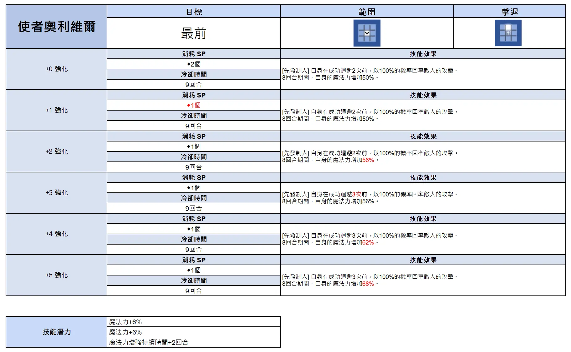 UT妈三皮技能都出来了,使徒妈+5满潜后,消耗1SP,CD9回合,可以先发制人在战斗开始前自动开技能,给自身加3次100%回避、10回合80%的魔攻BUFF;白妈妈在主线试用里的技能是消耗2SP,CD3回合,范围是和卢班希亚同款的大三角,每命中1个敌人恢复1点SP,并造成基础倍率230%+每命中1个敌人额外增加46%的倍率的单次魔法伤害,+5满潜推测应该是250%基础+根据敌人数量额外增加50%(可能还会有减SP或者其他效果),也就是说打5、7、9目标时分别是500%、600%、700%的倍率。