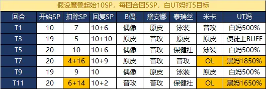 循环方面,使徒妈先发制人在战斗前就可以用,因此打10回合短轴的魔兽可以全程覆盖且不占用回合数,白妈和黑妈都是3回合CD可以轮流开无缝循环打满全程;如果是12回合魔兽则可以将使徒妈改成T3手动开,让BUFF覆盖后半段爆发最高的回合,也就是开局白妈、使徒,之后一样是黑妈和白妈轮流开即可,至于先开白还是先开黑就看魔兽BUFF决定了。反正不管是10回合还是12回合,黑妈+米卡OL一般都只打2轮爆发(前几回合吃不到魔兽BUFF,算不上爆发),排轴会非常灵活。
